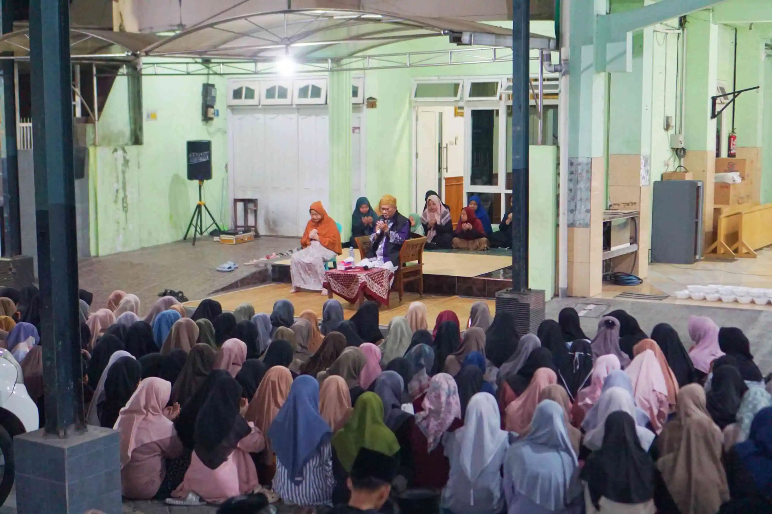 Setelah mengikuti rutinan ngaji malam, para santri berkumpul di halaman pondok pesantren Al-Jihad Surabaya untuk menyambut kedatangan KH. Much. Imam Chambali. Dengan suasana haru, para santri melantunkan shalawat yang dipimpin oleh grup sholawat Riqqul Habib sebagai bentuk syukur dan penghormatan atas kepulangan sang pengasuh.